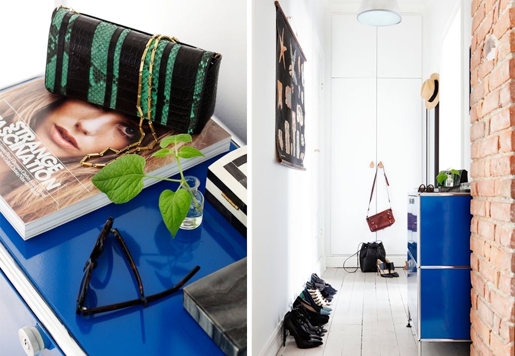Den Yves Klein-blå kommoden fra USM Haller lyser opp i gangen. De fineste skoparene får stå utenfor skapet.
