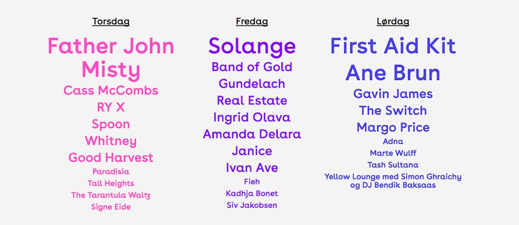 AvFor fjerde året på rad arrangeres tre dagers festival som fyller Vigelandsparken med musikkglade mennesker og et knippe av verdens beste artister. I år er det Solange, Gavin James, Father John Mist og Whitney som tar turen til den norske scenen.