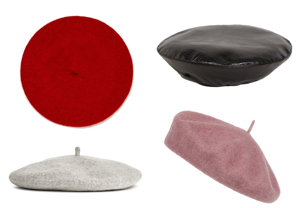 Rød alpelue i filt fra Zara, 139 kr // Svart alpelue i vinyl fra Mango, 199 kr // Grå alpelue i ull fra H&M, 99 kr // Alpelue i pudderrosa fra Accessorize, 175 kr.