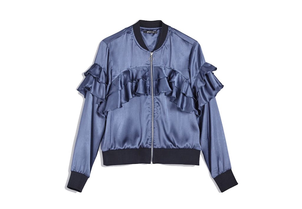 Volanger er fortsatt i vinden, og gjør seg like bra på en pilotjakke som på kjoler og topper. Et skinnende materialet i en feminin farge er med på å pynte opp et ellers så kjedelig antrekk.