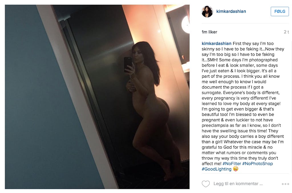 Flere internasjonale medier har i det siste beskyldt Kim Kardashian West for å lyve på seg sin siste graviditet, fordi hun ikke har lagt på seg like mye som under forrige svangerskap. Men Kim lar seg jo ikke vippe av pinnen så lett, så for å sette en stopper for spekulasjonene - eller bare for gøy, hva vet vi - la hun like godt ut en splitter naken-selfie med den gravide magen godt synlig på Instagram.