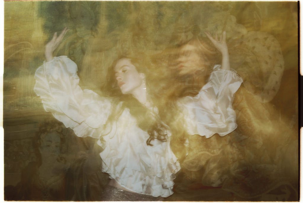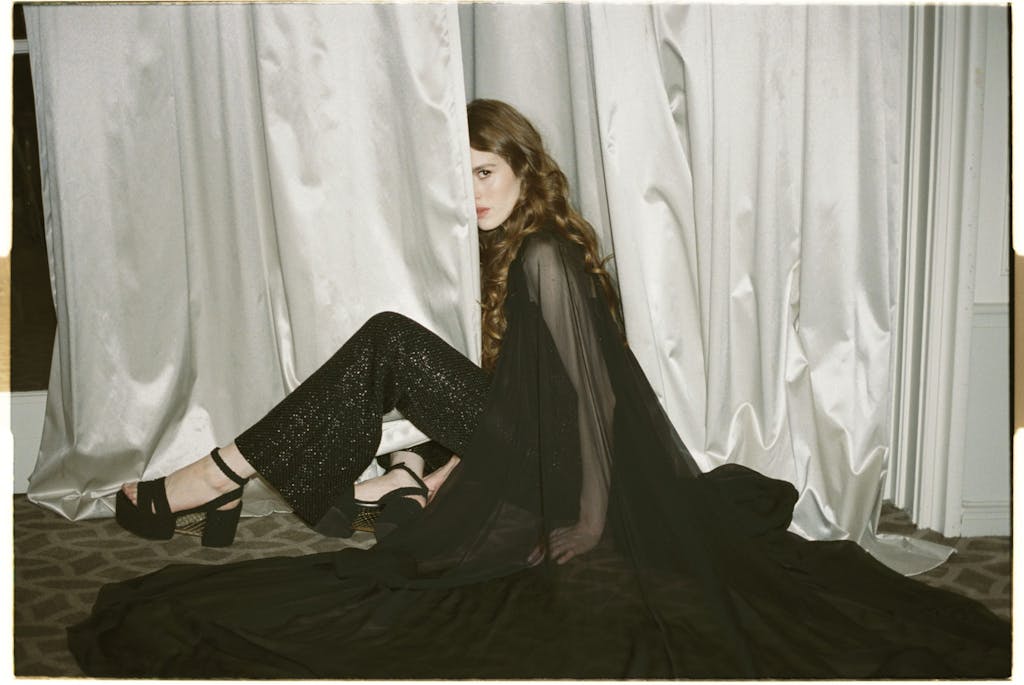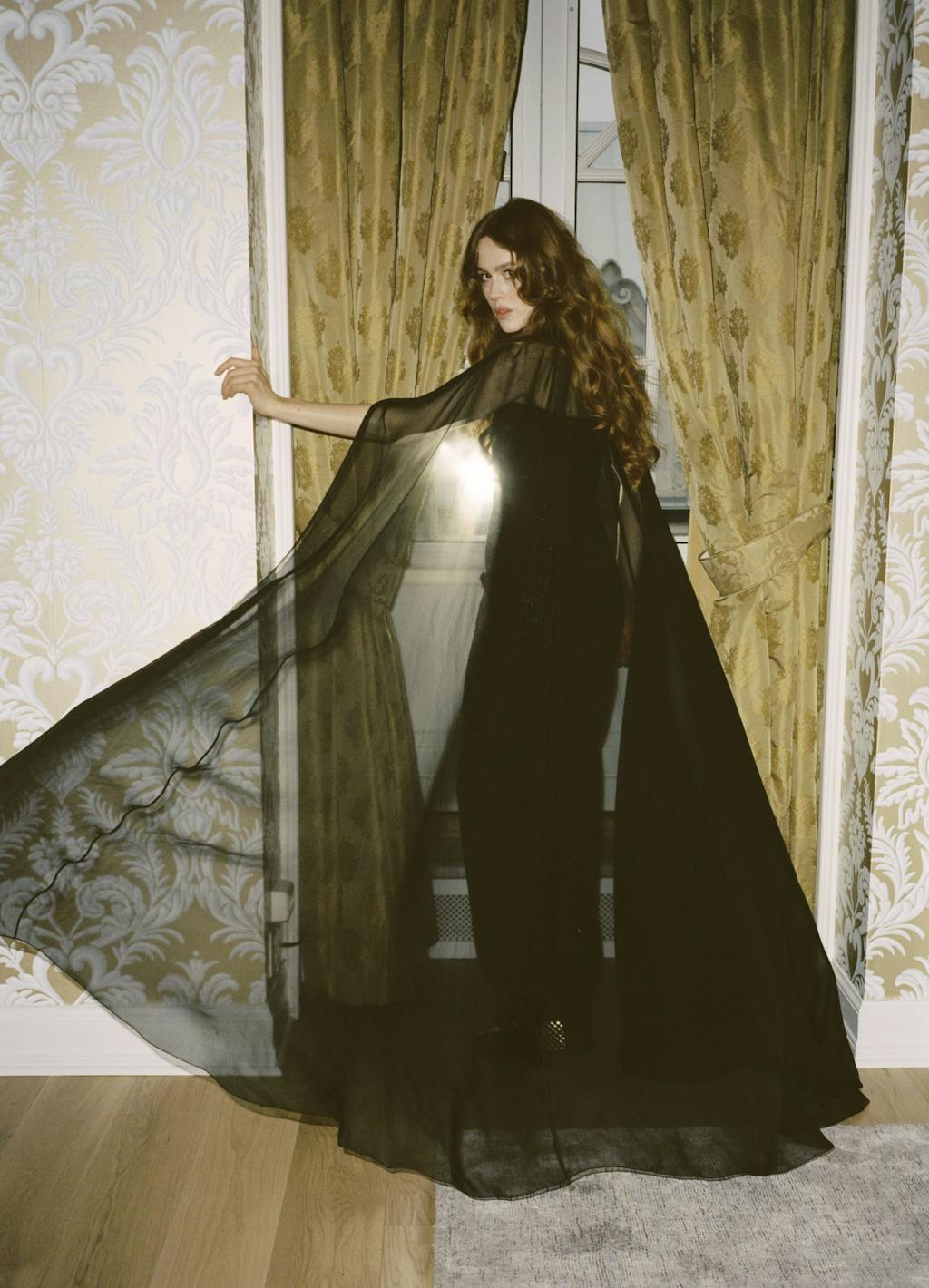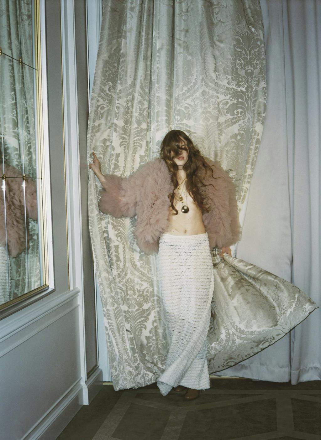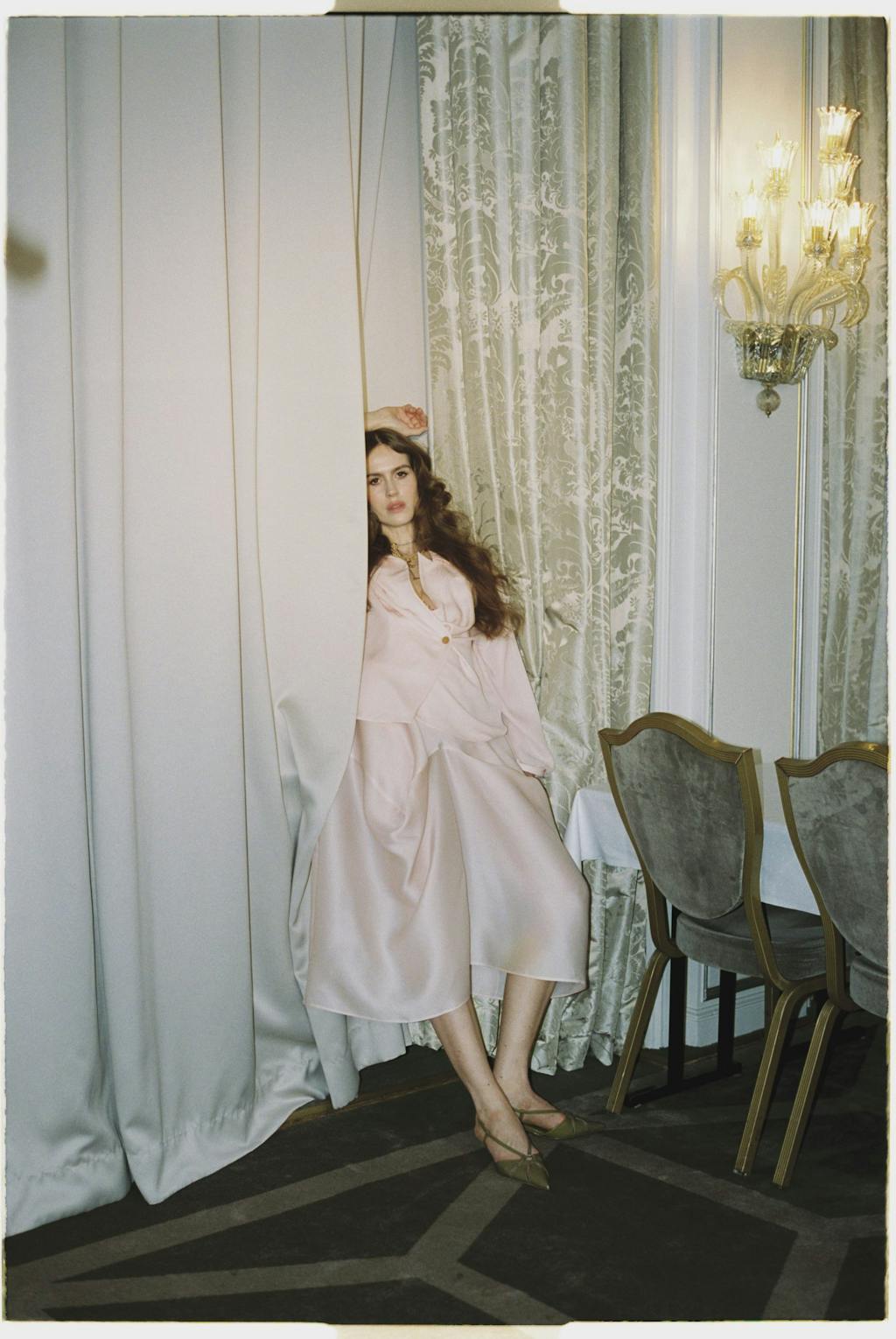 Blondies Heart of Glass bølger gjennom speilsalen mens Ullebø lener seg mot tunge, lange gardiner iført et tyggegummirosa, voluminøst sett fra Khaite.