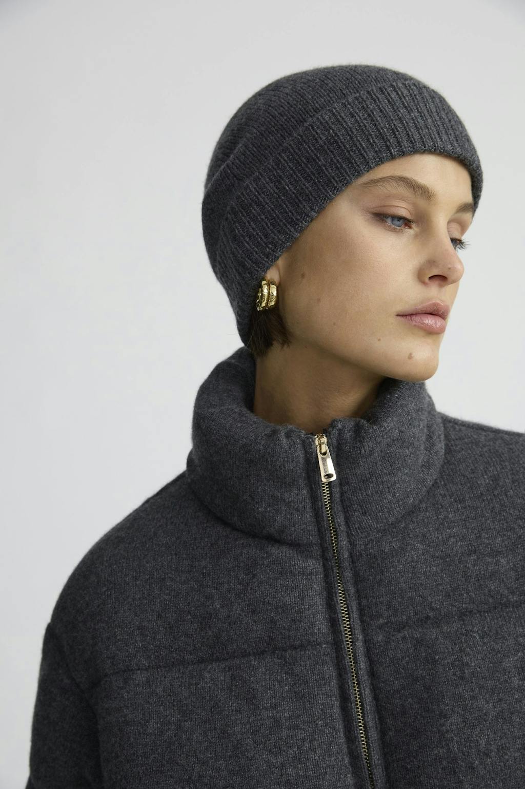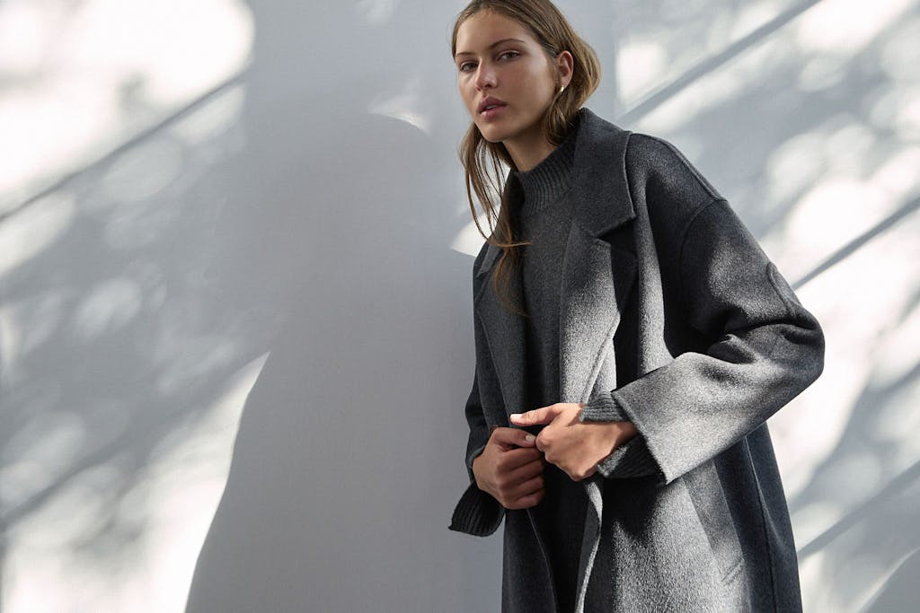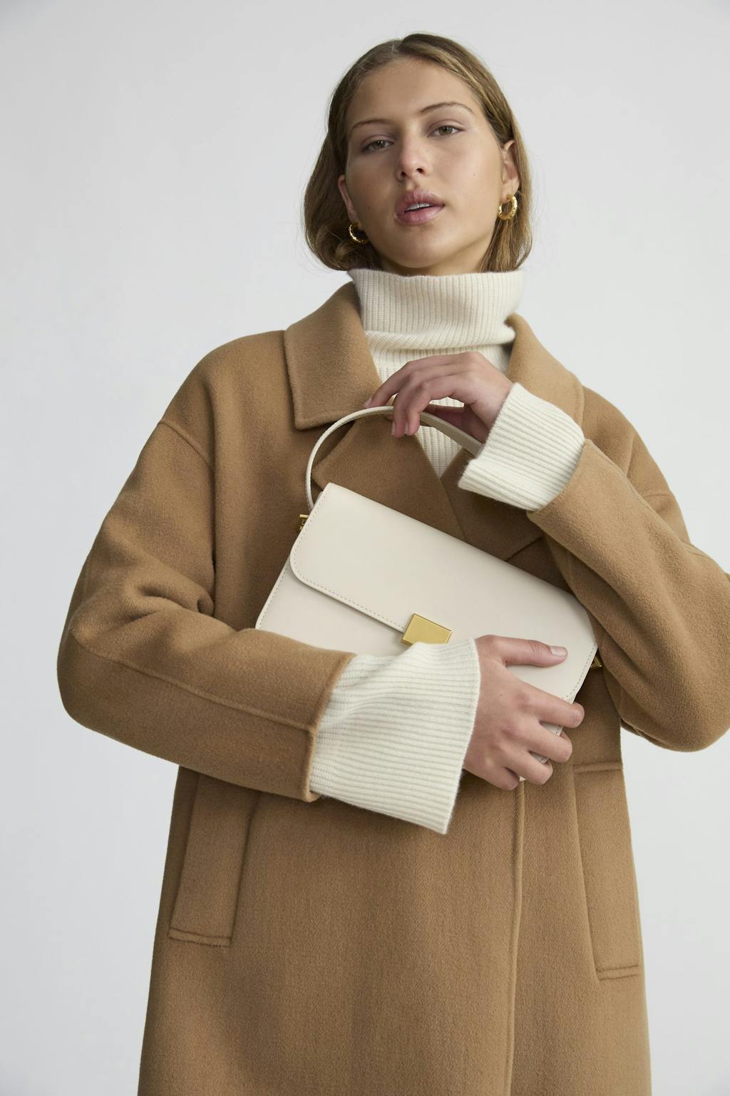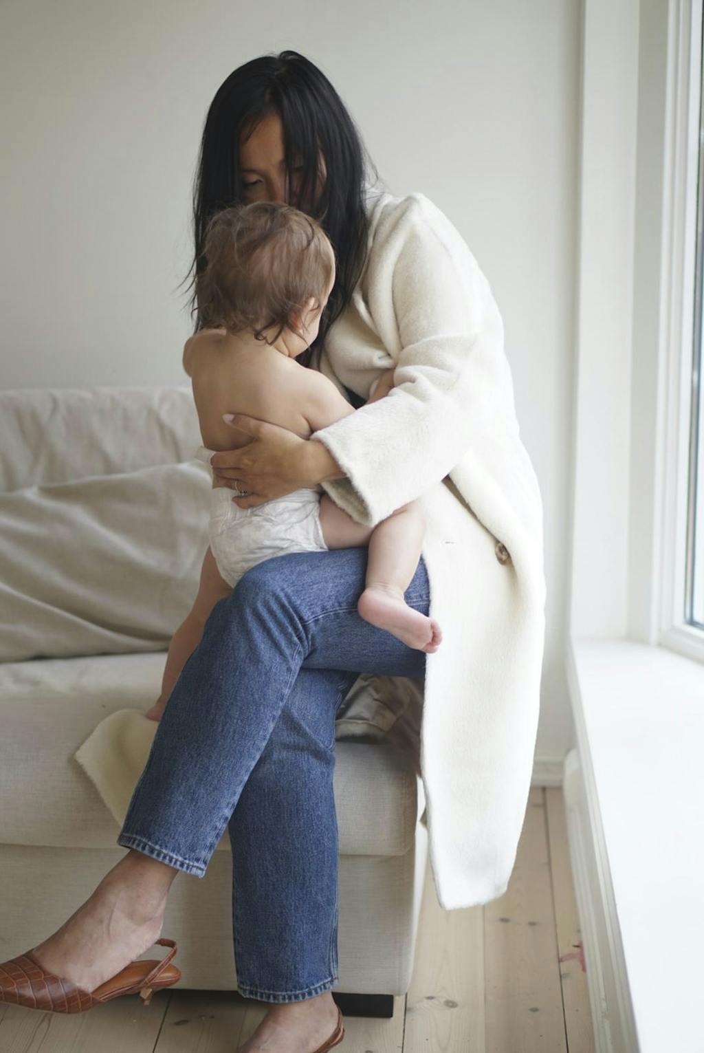 Hun har svart langt hår og er kledd i svart genser, svart bukse og svarte sko. Hunden hennes Cashew, en hvit samojed, svinser rundt oss i det hvitmalte studioet hvor store vinduer slipper dagslyset inn. Vi går bort til stativene med kamelkåpene vi stadig ser både på gaten og i Instagram-feeden vår, løfter opp de monokrome, elegante boksveskene som står oppstilt og kjenner på de myke strikkeplaggene. Det er et dust og minimalistisk univers hun har skapt. Alt går i beige, svart, hvitt og grått med kvaliteter som kasjmir, bomull og skinn. Snittene føles moderne, helhetsinntrykket er 100 prosent chic.