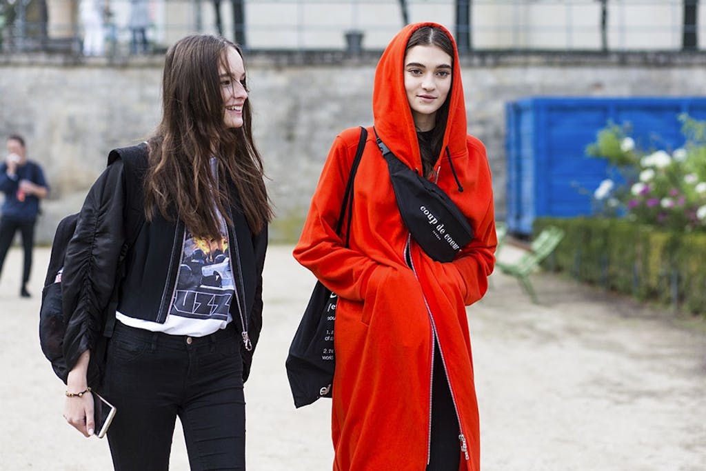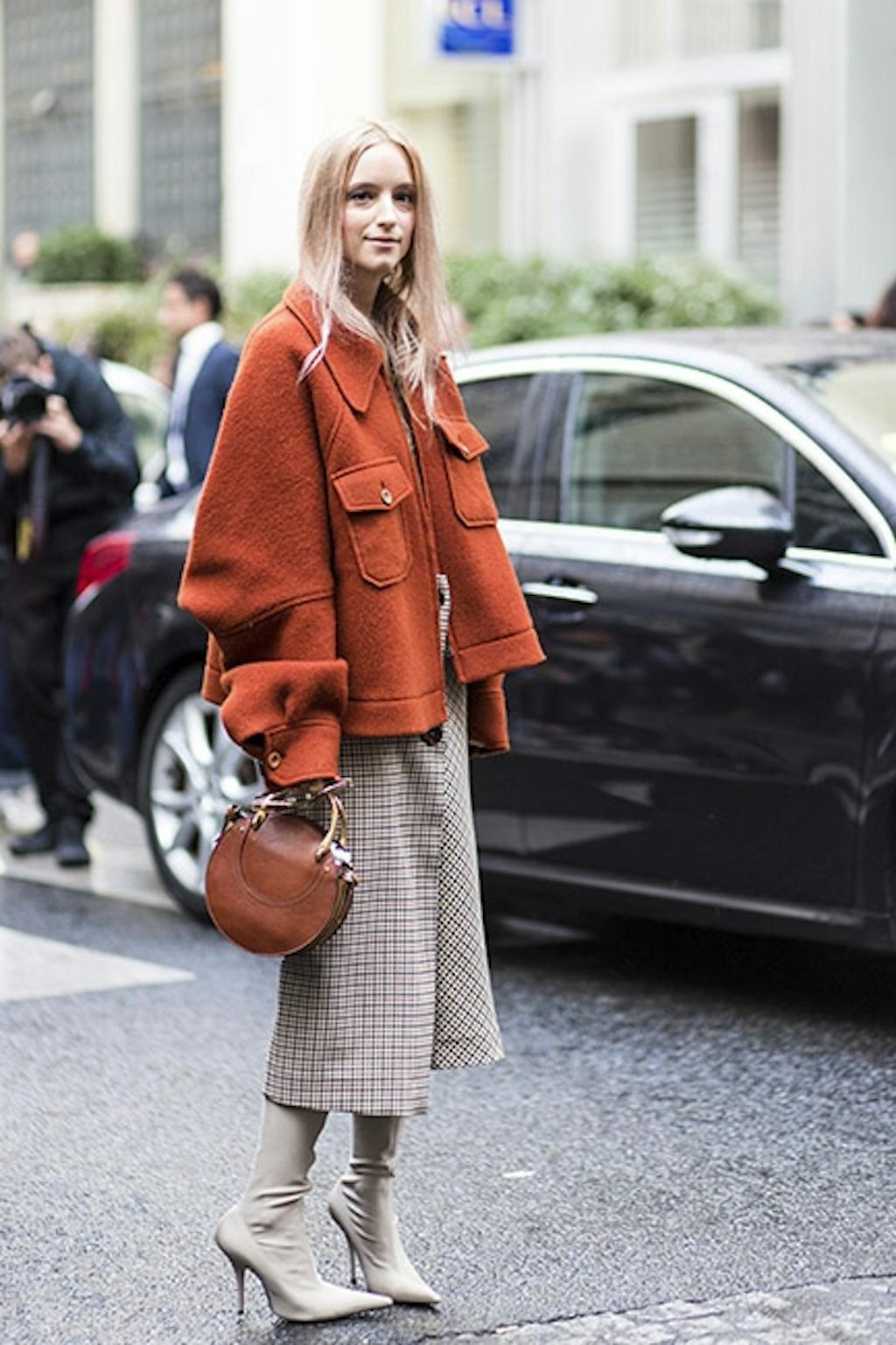 It-jenta og bloggeren Camille Charrière er god når det kommer til miksing av materialer. Under moteuken i Paris ble hun avfotografert med sesongen it-jakke, som fortsatt er boblejakken. Om du synes jakken er hakket for maskulin og formløs, kan du pynte deg med et par store øredobber og iøynefallende smykker slik at helheten blir mer feminin. Hvor kult er det ikke med en boblejakke i skinn?