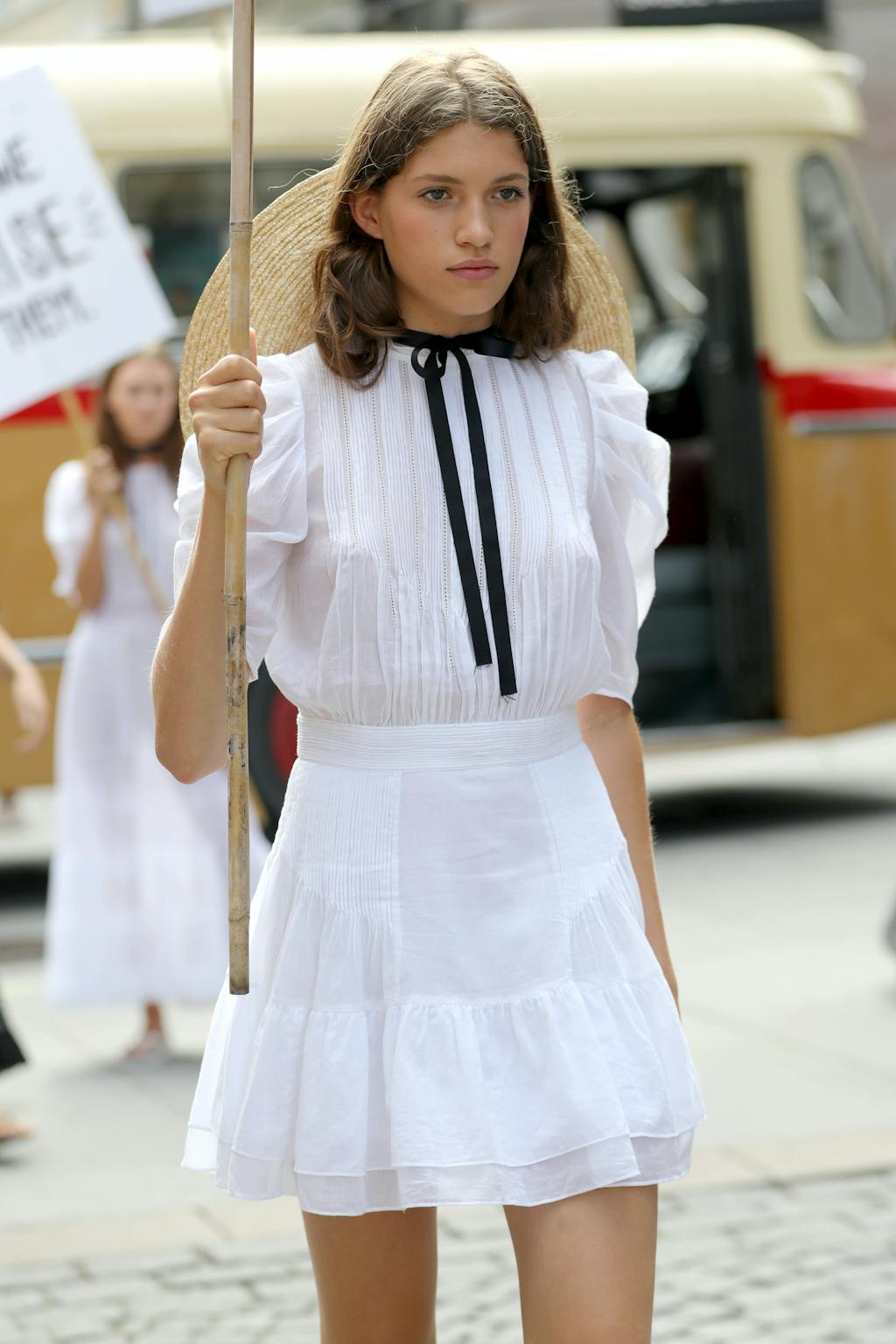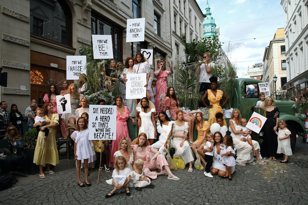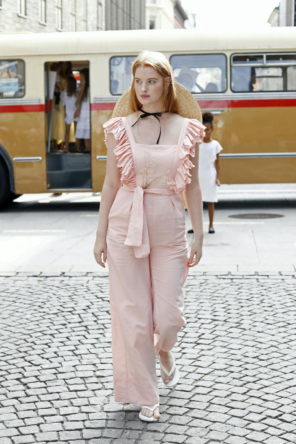 I samarbeid med Promenaden fyltes to rader med benker for den norske moteeliten i Nedre Slottsgate, og midt i mellom kom den ene modellen etter den andre ut av en veteranbuss ikledd Pias vakre design og et skilt med feministiske paroler, mens musikeren Silya Nymoen sang live på en lastebil midt i mellom potter og planter.
