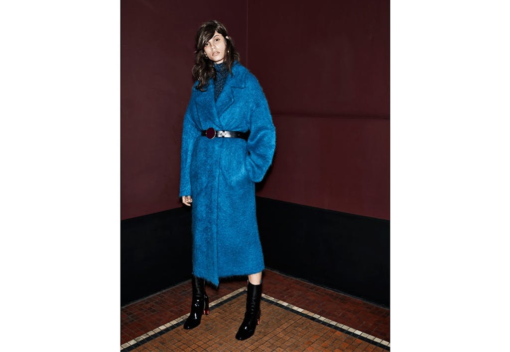 Vi elsker den blå kåpen, den burgunderrøde fargen og støvlettene.