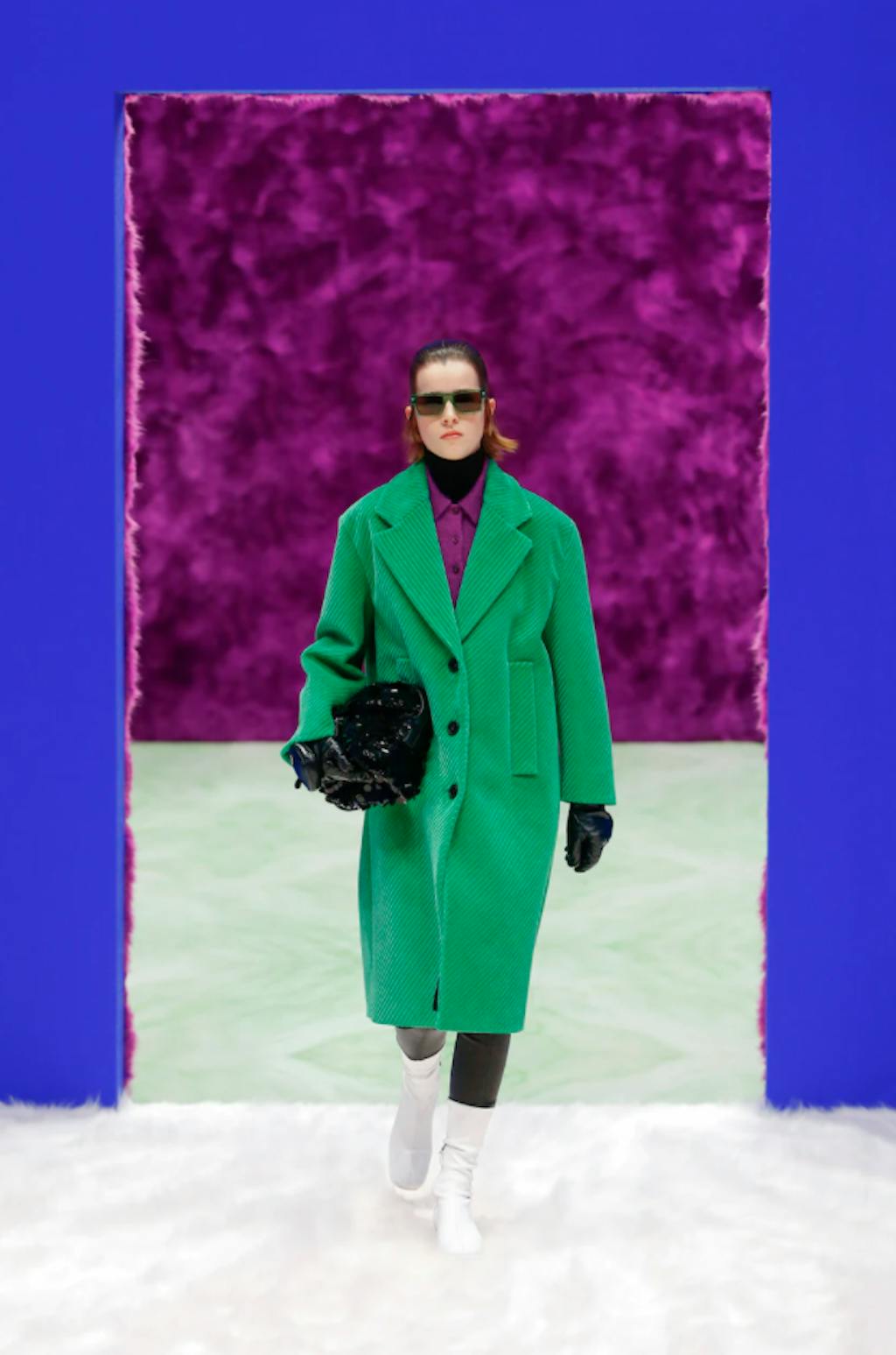 Dersom du er fan av den grønne fargen, kan du som hos Ganni hoppe i et gressgrønt antrekk fra topp til tå. Alternativt kan du velge et mer nedtonet antrekk med kun ett enkelt grønt plagg - for eksempel i form av en gressgrønn ullgenser eller en grønn høstjakke som hos Prada. På denne måten vil du garantert lyse opp blant høstens og vinterens mørke og ellers avdempede fargeskala.