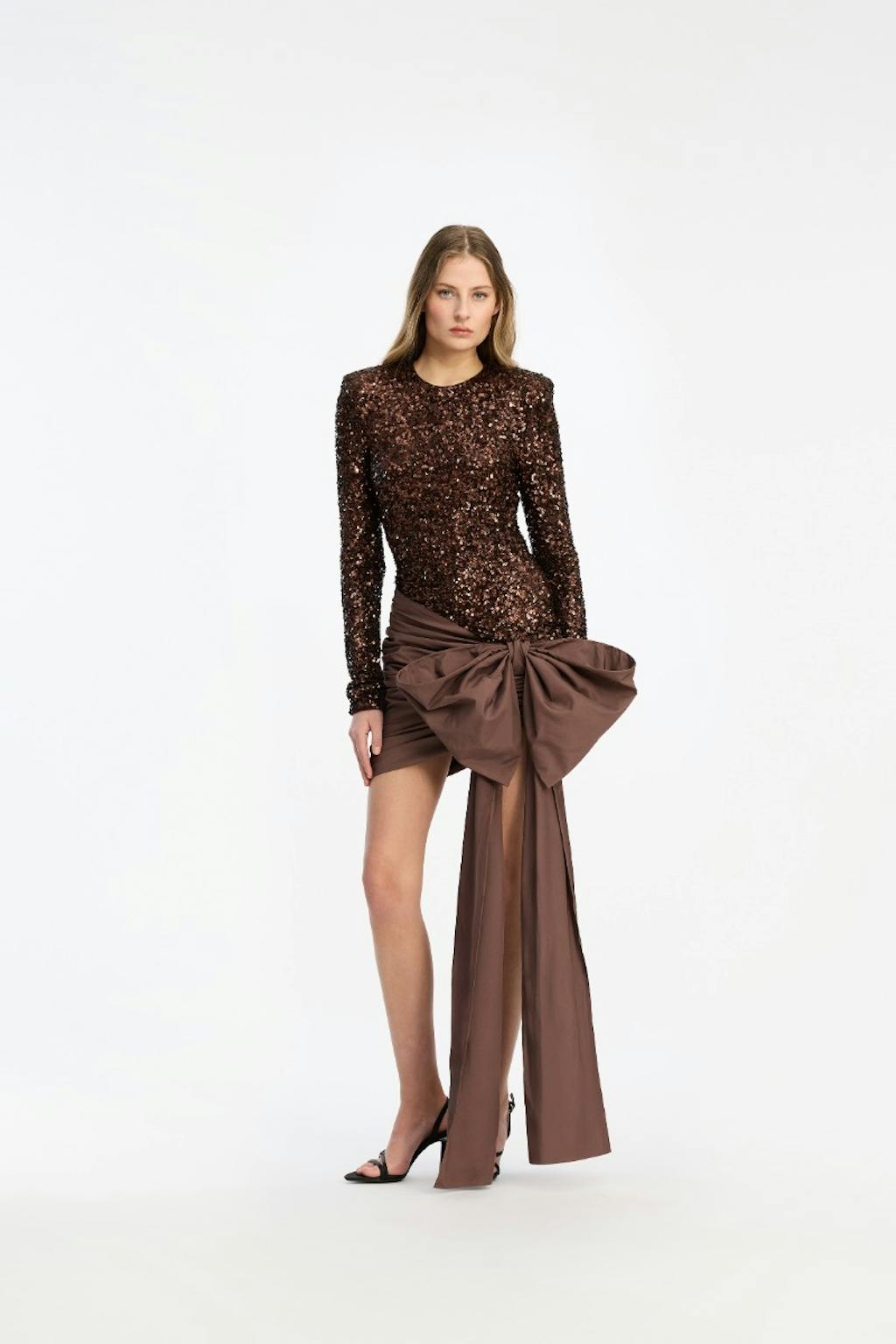 Denne stilige kjolen fra Rotate imponerer med sin unike sløyfe og glitrende brunfarge. Perfekt for årets festligheter hvis du ønsker et iøynefallende antrekk.