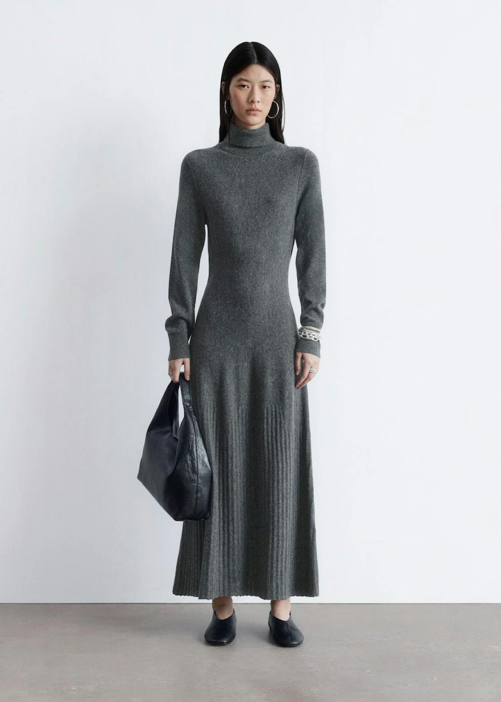 Denne flotte grønne kjolen er klassisk samtidig som den har kant. Style den med et par høye støvletter og store øredobber.