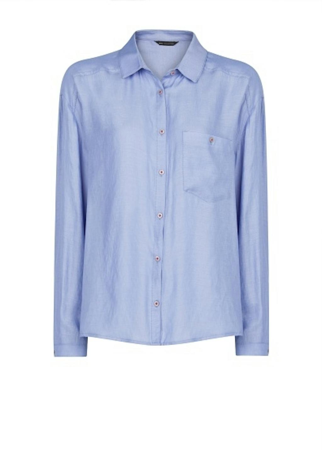 En lyseblå, herreinspirert skjorte er klassisk og kan brukes i mange ulike anledninger. Gi antrekket en chic vri ved å pynte opp med enkle smykker i gull.