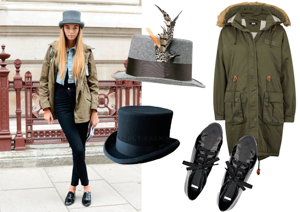 Lek med det herreinspirerte uttrykket ved å tilføre snøresko i lakk til antrekket. Skap en fin balansegang slik Mia Matic gjør ved å bruke hatten sammen med parkasen din.
