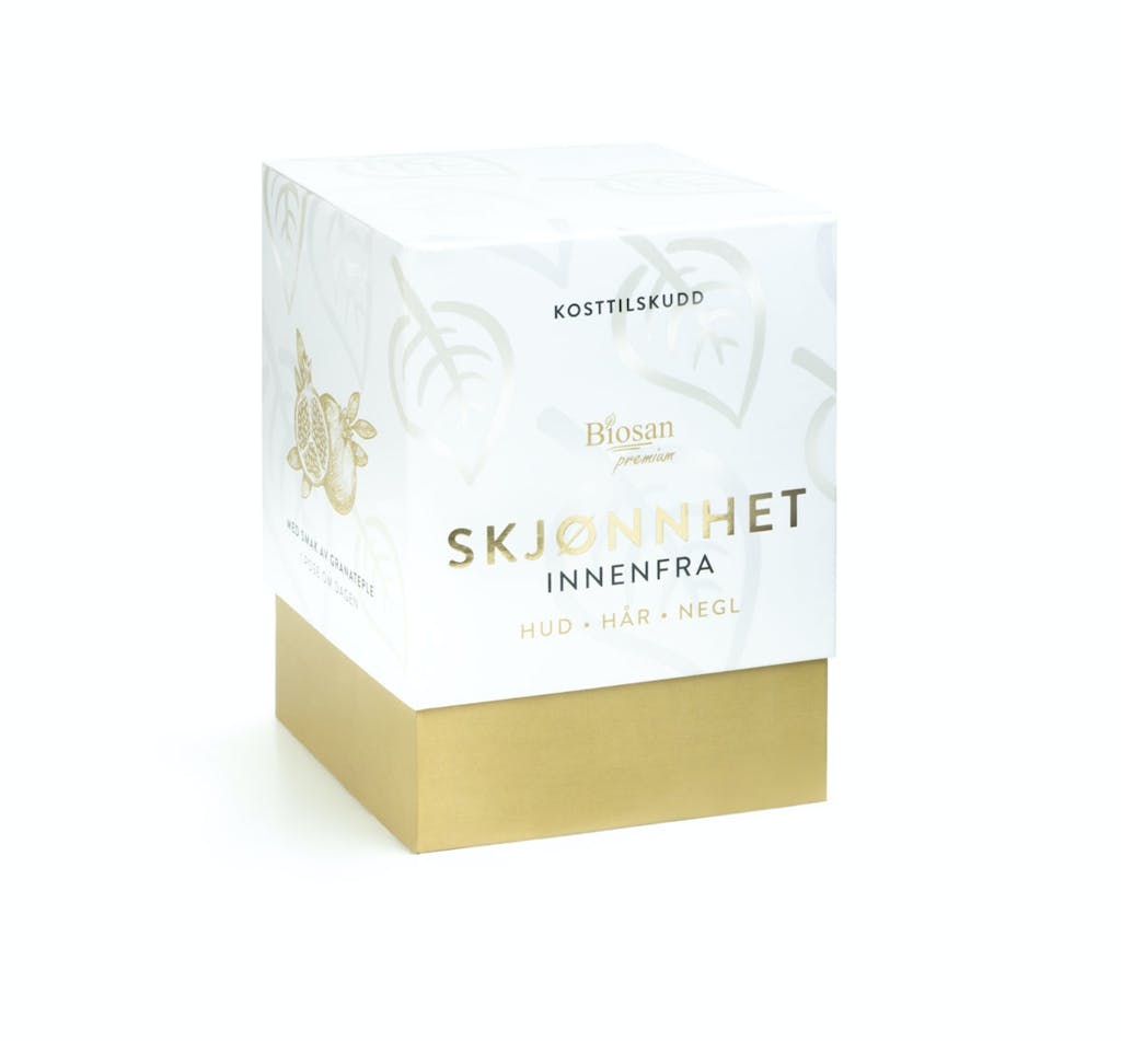 Biosan Skjønnhet inneholder kollagen i høy kvalitet, hyaluronsyre som binder fuktigheten i huden og melkesyrebakterier som gir en god tarmflora. I tillegg inneholder det vitaminer og mineraler som gir hud, hår og negler ekstra næring innenfra og for maksimalt opptak i kroppen.
