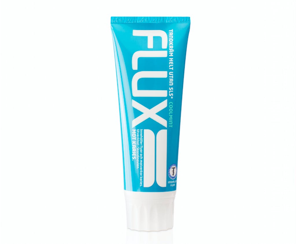 Tips! Flux tannkrem er en fluortannkrem mot karies, som også motvirker slitasje på tannemaljen. Den er utviklet i nært samarbeid med svenske tannleger. Tannkremen er helt uten SLS (såpestoff) og fri for allergener. Den inneholder anbefalt mengde fluor, som er 1450 ppm F.