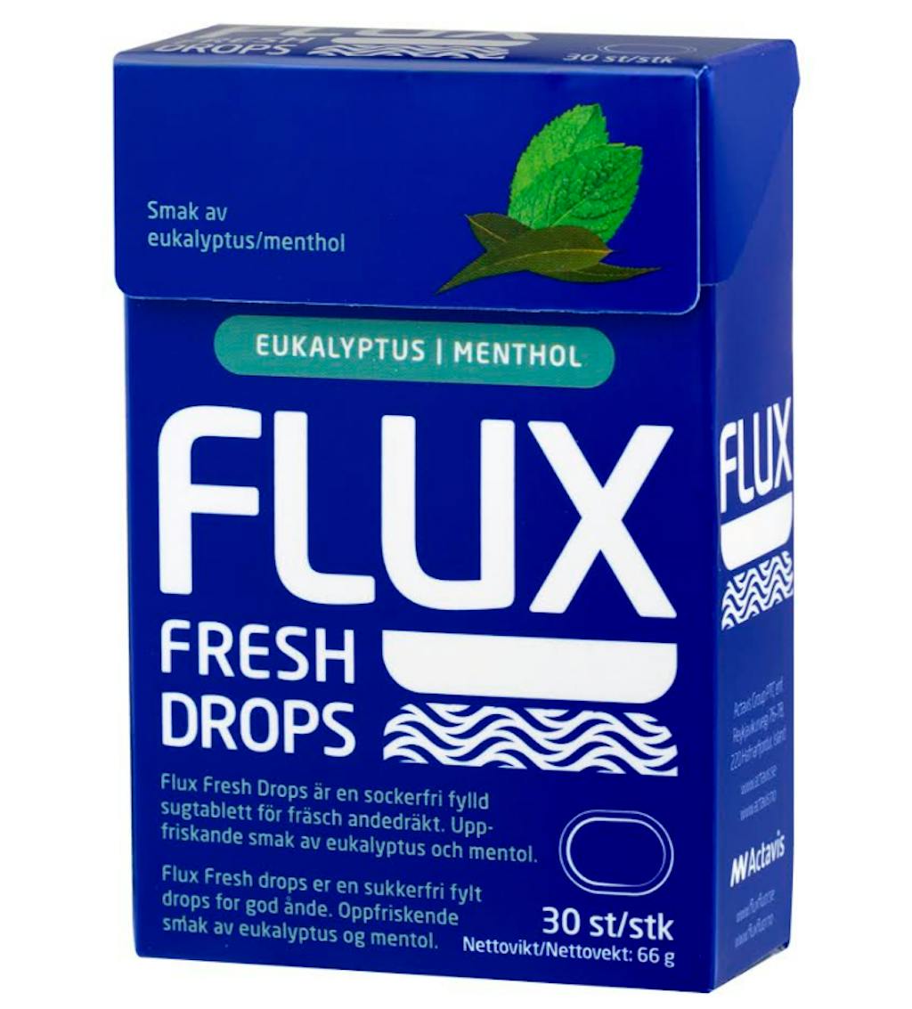 Tips! Flux Drops Fresh er en sukkerfri fylt sugetablett med umiddelbar virkning for frisk pust. Den har en forfriskende smak av eukalyptus og mentol. Flux Drops Fresh inneholder, i tillegg til sink, fluor (0,05 mg F) som forhindrer karies.
